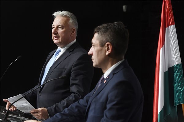 Semjén Zsolt nemzetpolitikáért felelős miniszterelnök-helyettes (b) és Potápi Árpád János, a Miniszterelnökség nemzetpolitikáért felelős államtitkára a Magyar Diaszpóra Tanács plenáris ülésének szünetében tartott sajtótájékoztatón a Várkert Bazárban 2017. november 9-én. (MTI Fotó: Koszticsák Szilárd)