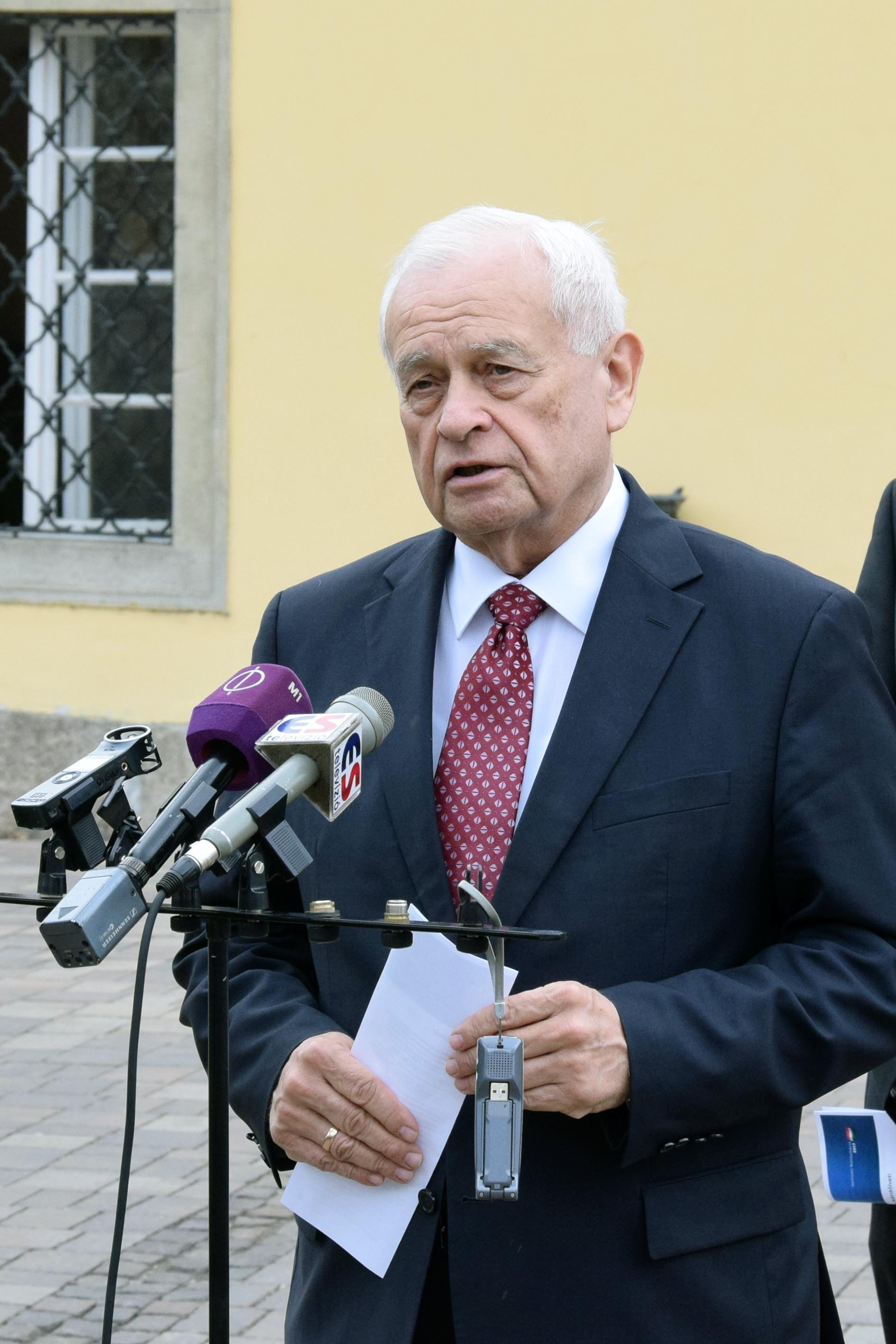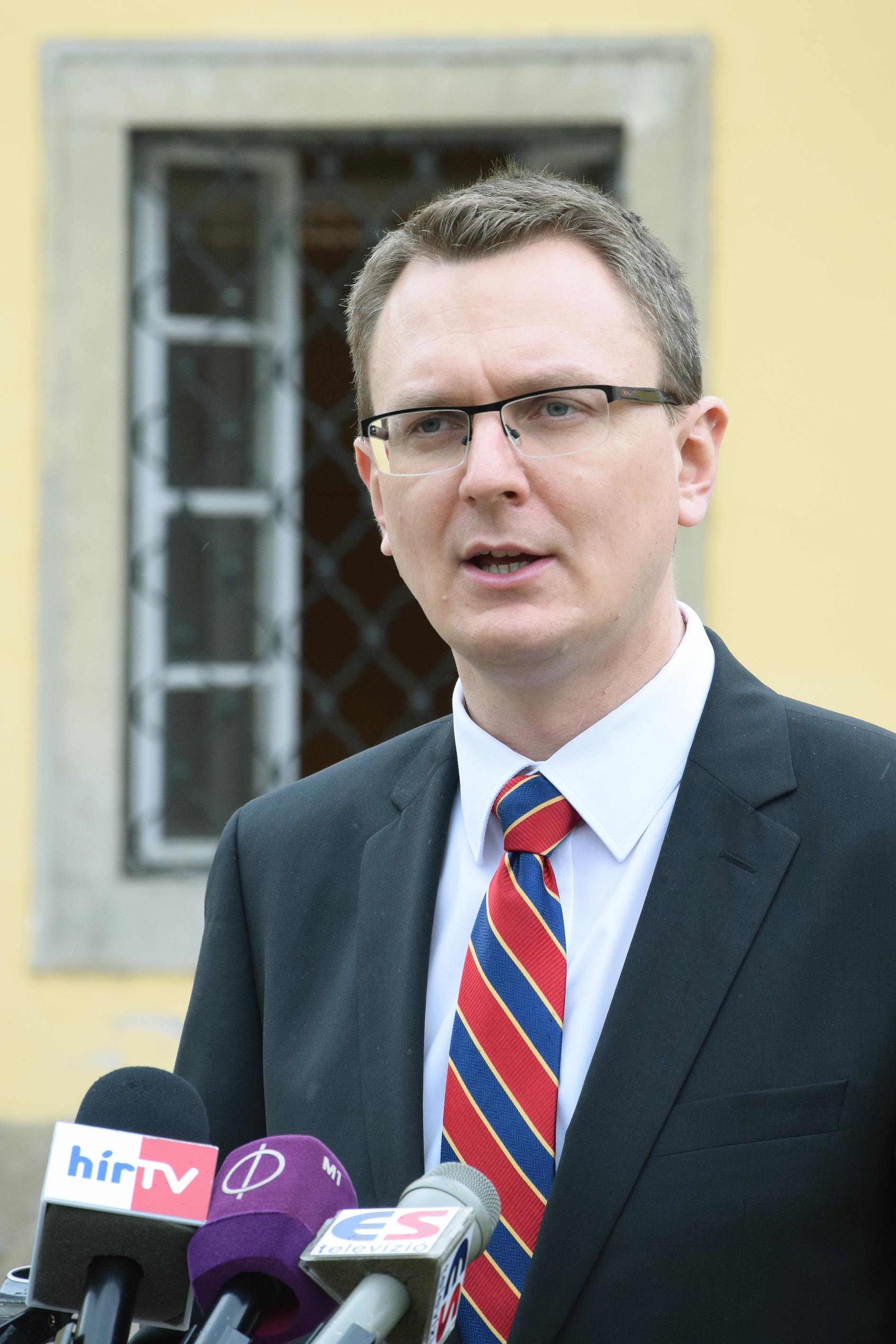 Harrach Péter, a Kereszténydemokrata Néppárt frakcióvezetője sajtótájékoztatót tart a váci polgármesteri hivatal előtt (Fotó: Váli Miklós)
