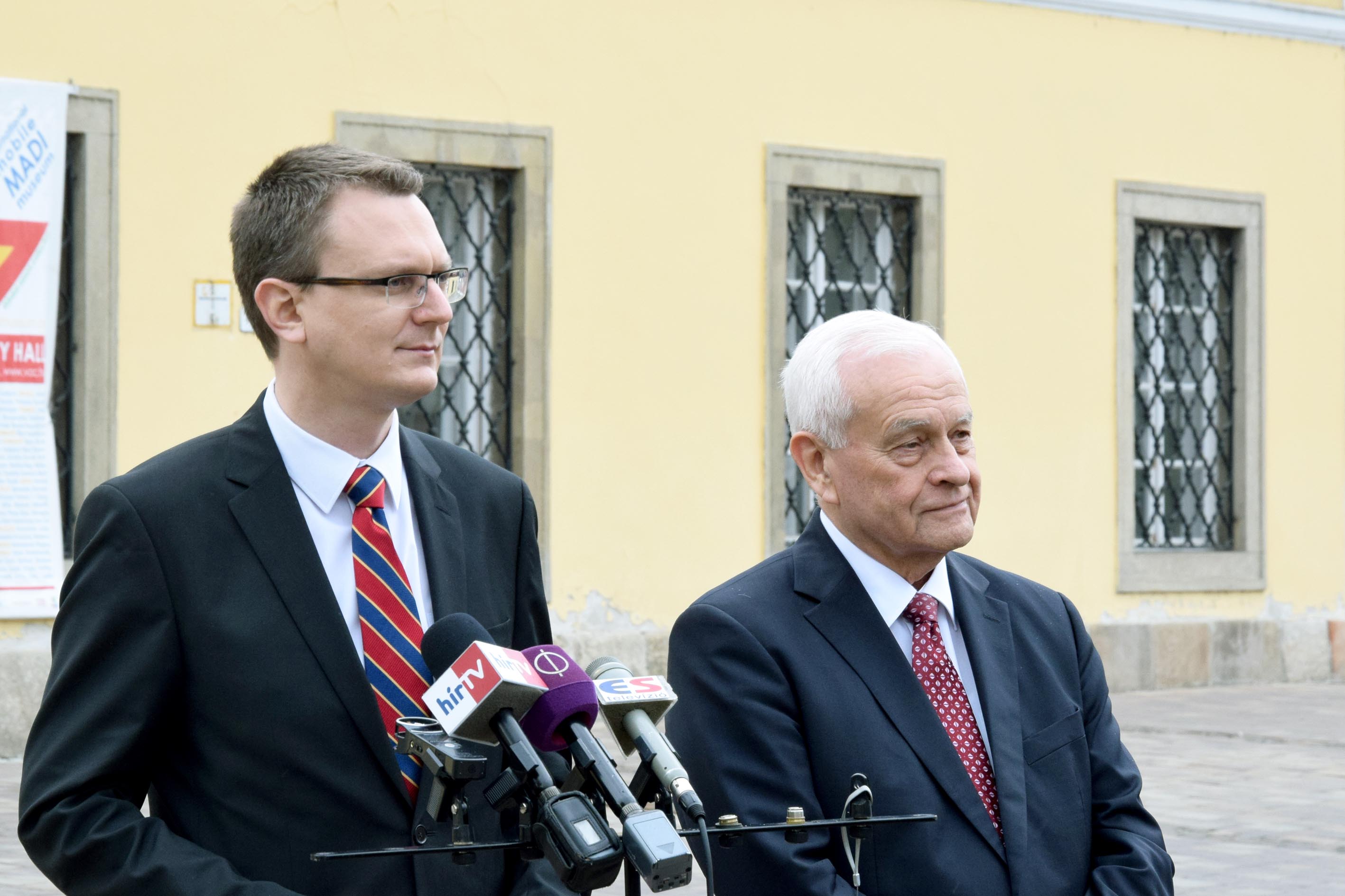 Rétvári Bence, a Kereszténydemokrata Néppárt alelnöke és Harrach Péter, a Kereszténydemokrata Néppárt frakcióvezetője sajtótájékoztatót tart a váci polgármesteri hivatal előtt (Fotó: Váli Miklós)