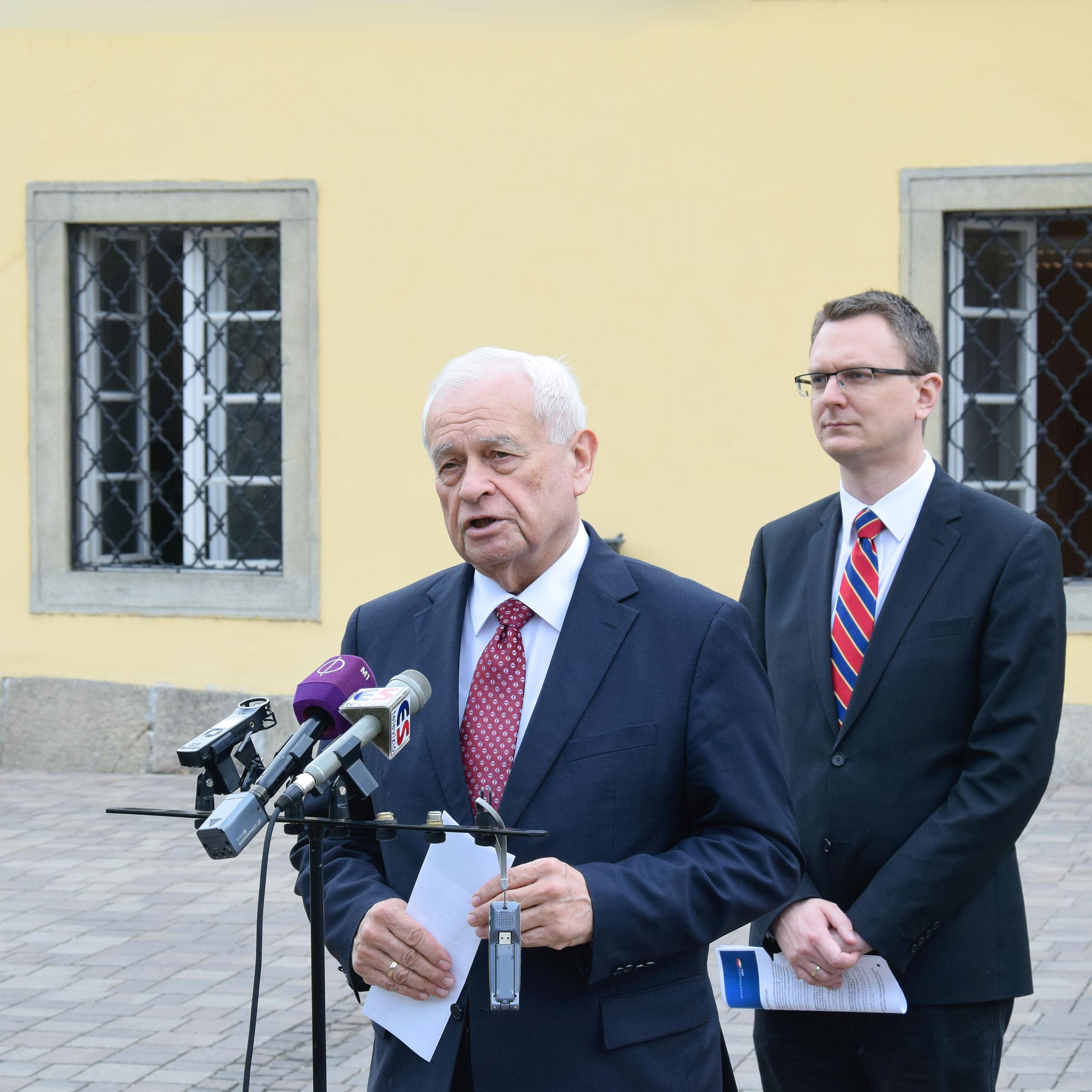 Harrach Péter, a Kereszténydemokrata Néppárt frakcióvezetője és Rétvári Bence, a Kereszténydemokrata Néppárt alelnöke sajtótájékoztatót tart a váci polgármesteri hivatal előtt (Fotó: Váli Miklós)