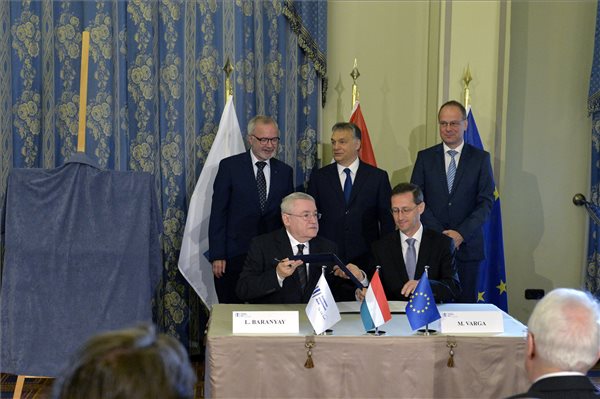 Varga Mihály nemzetgazdasági miniszter és Baranyay László, az Európai Beruházási Bank (EIB) alelnöke refinanszírozási szerződést ír alá tornatermek, uszodák, sportpályák és óvodák építéséről az EIB budapesti irodájának hivatalos megnyitóünnepségén a Magyar Tudományos Akadémia épületében 2016. június 13-án. A háttérben Orbán Viktor miniszterelnök, Werner Hoyer, az Európai Beruházási Bank (EIB) elnöke (b) és Navracsics Tibor, az Európai Bizottság kultúráért, oktatásért, ifjúságért és sportért felelős biztosa. (MTI Fotó: Koszticsák Szilárd)