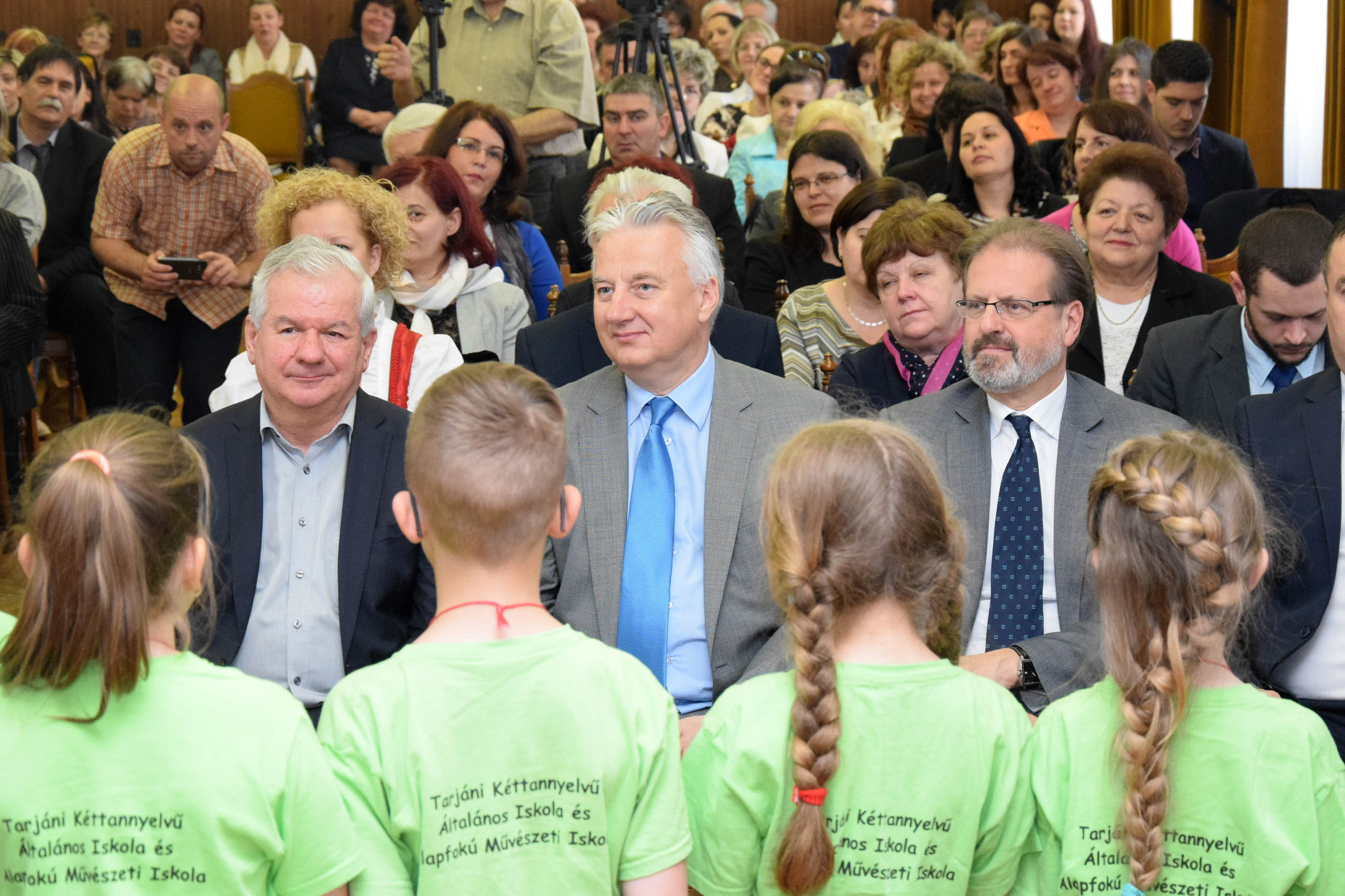 Kiss Rigó László Szeged-Csanádi Egyházmegye püspöke, Semjén Zsolt miniszterelnök-helyettes, a Kereszténydemokrata Néppárt elnöke és Jenik Péter a miniszterelnök-helyettes kabinetirodájának vezetője a Tarjáni Kéttannyelvű Általános Iskola és Művészeti Alapiskola diákjainak műsorát nézik (KDNP Fotó: Váli Miklós)