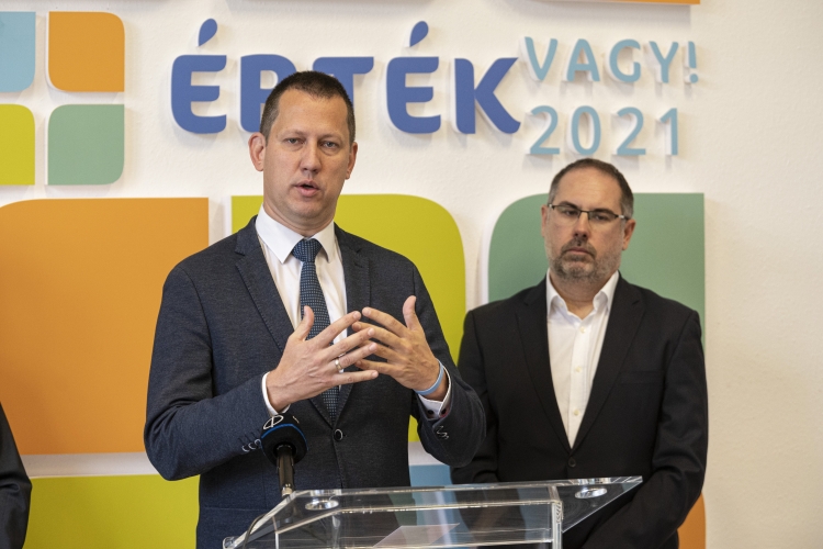 Fülöp Attila szociális ügyekért felelős államtitkár (b) a megváltozott munkaképességűek foglalkoztatásához kapcsolódó jövő évi támogatásról tartott sajtótájékoztatón az Emberi Erőforrások Minisztériumában 2021. október 6-án. A megváltozott munkaképességű embereket foglalkoztató akkreditált cégek támogatására 50,1 milliárd forintot biztosít a költségvetés 2022-ben, a pályázatra október 30-ig lehet jelentkezni. Jobbról Csizi Péter, a Kézmű-Erfo-Főkefe cégcsoport ügyvezető igazgatója (Fotó: MTI / Szigetváry Zsolt)