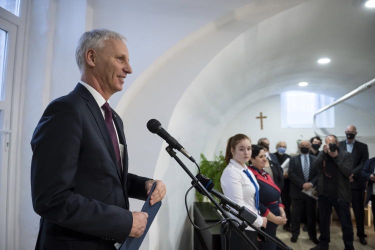 Soltész Miklós, a Miniszterelnökség egyházi és nemzetiségi kapcsolatokért felelős államtitkára, a KDNP alelnöke beszédet mond a nézsai Mikszáth Kálmán Szlovák Nemzetiségi Általános Iskola felújítása első ütemének átadásán 2022. február 23-án. MTI/Komka Péter