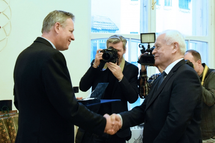 Zombor Gábor, Kecskemét országgyűlesi képviselője (balra) adta át Harrach Péternek az elismerést (KDNP Fotó: Váli Miklós)