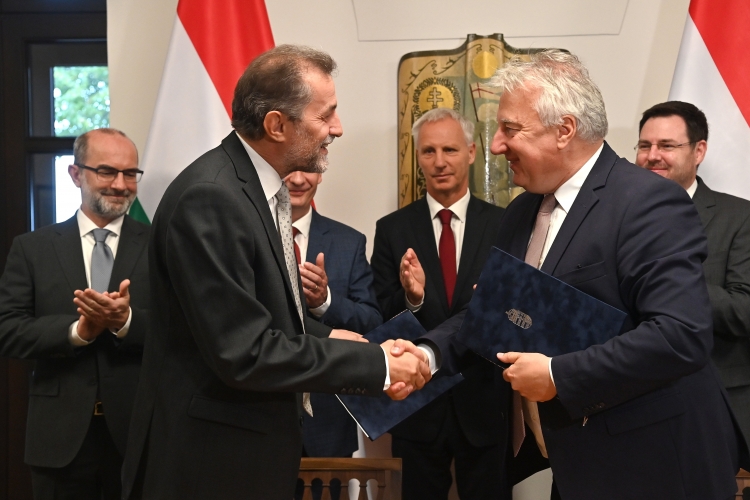 Semjén Zsolt nemzetpolitikáért, egyházügyekért és nemzetiségekért felelős miniszterelnök-helyettes (jobbra) és Papp János, a Magyarországi Baptista Egyház elnöke átfogó megállapodást ír alá a Karmelita kolostorban 2021. szeptember 20-án. Mögöttük Soltész Miklós, a Miniszterelnökség egyházi és nemzetiségi kapcsolatokért felelős államtitkára (jobbról a harmadik) és Elijah M. Brown, a Baptista Világszövetség főtitkára (jobbról a második). Fotó: MTI / Illyés Tibor