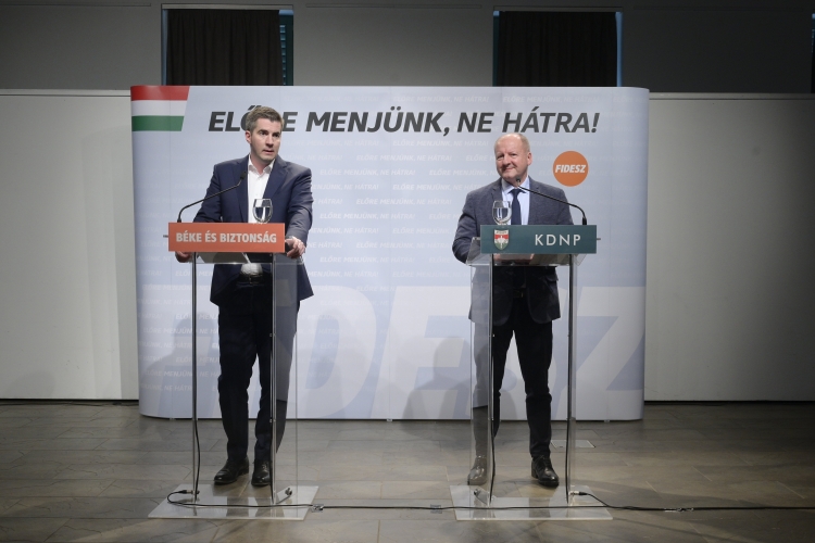 Simicskó István, a Kereszténydemokrata Néppárt (KDNP) jobbról, és Kocsis Máté, a Fidesz frakcióvezetője sajtótájékoztatót tart a Fidesz-KDNP kihelyezett frakcióülése után a balatonfüredi Kisfaludy Galériában 2023. február 23-án. MTI/Koszticsák Szilárd