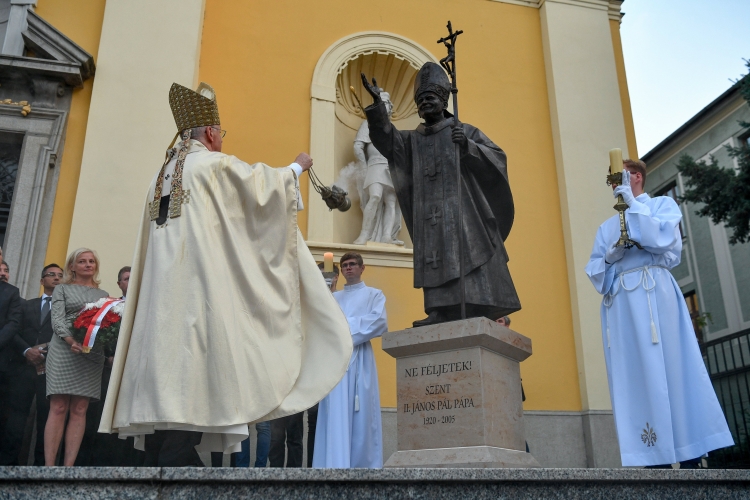 Debreceni látogatásának harmincadik évfordulóján, szerdán a helyi Szent Anna-székesegyház előtt felavatták Szent II. János Pál pápa egészalakos szobrát, Kovács Jenő szobrászművész alkotását.
