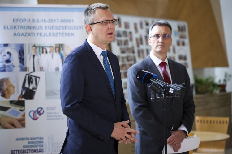 Rétvári Bence, a Belügyminisztérium parlamenti államtitkára, a KDNP alelnöke (b) és Tóth Tibor orvosszakmai projektvezető az Országos Mozgásszervi Intézet XII. kerületi székhelyén tartott sajtótájékoztatón 2023. június 14-én. Országszerte harminc intézményben kezdték meg az új elektronikus járóbeteg-irányítási rendszer tesztelését. MTI/Hegedüs Róbert