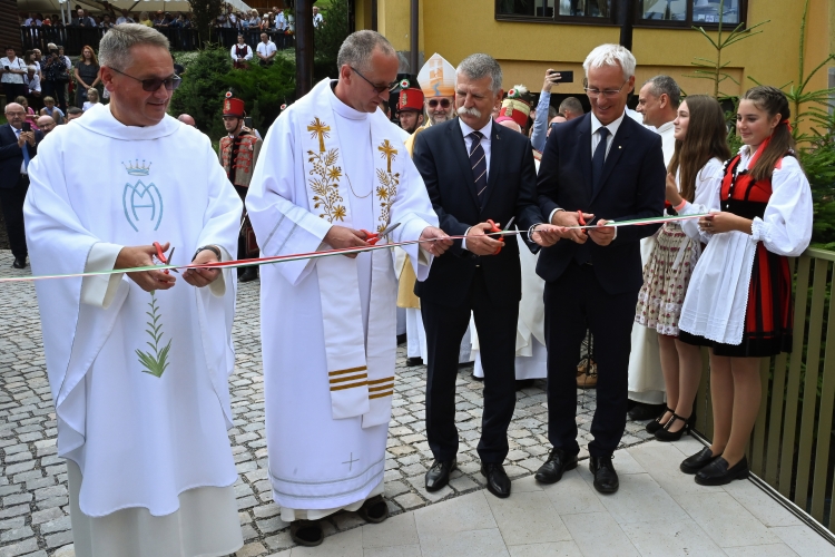 Kövér László, az Országgyűlés elnöke (k), Soltész Miklós, a Miniszterelnökség egyházi és nemzetiségi kapcsolatokért felelős államtitkára (j), Bátor Botond, a hargitafürdői rendház vezetője (b2) és Arnold Chrapkowski, a pálos rend generálisa (b) átvágja a nemzeti színű szalagot a magyar kormány támogatásával épült pálos kolostor és kápolna felszentelésén a székelyföldi Hargitafürdőn 2023. augusztus 20-án. MTI/Kátai Edit