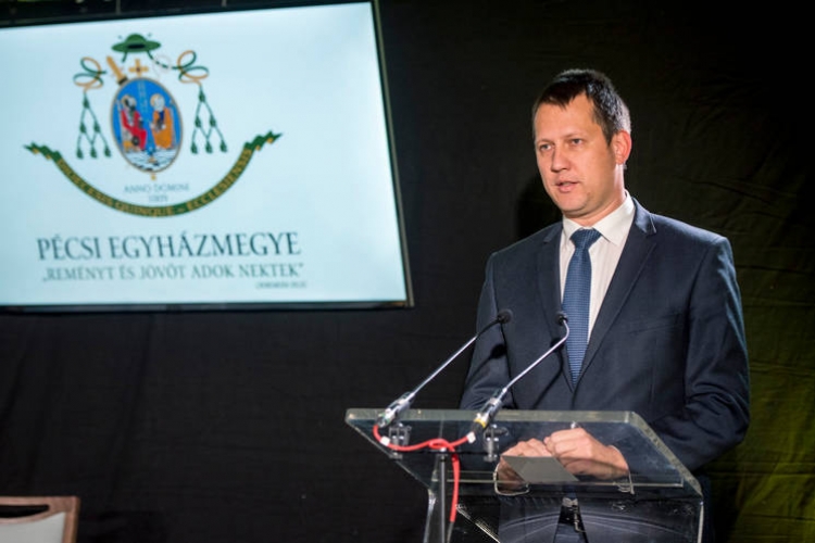 Fülöp Attila (KDNP), az Emberi Erőforrások Minisztériumának (Emmi) szociális ügyekért felelős államtitkára beszédet mond a pécsi katolikus egyházmegye fenntartásában működő Szent Lőrinc Gondozóotthon 1,4 milliárd forint kormányzati támogatásból létesült új, csaknem háromezer négyzetméteres épületrészének átadásán (Fotó: mno.hu)