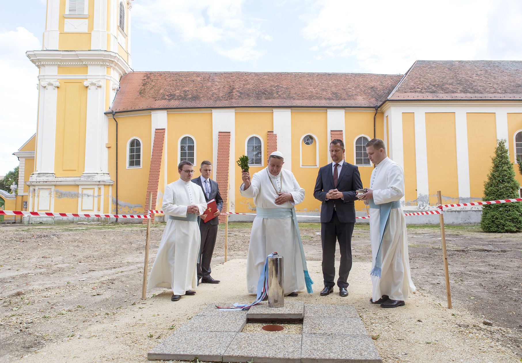 Fazakas Zoltán Márton csornai premontrei perjel (k) Fülöp Attila, az Emberi Erőforrások Minisztériumának (Emmi) szociális ügyekért felelős államtitkára (j2) jelenlétében megáldja a premontrei apátság idősotthonának alapkövét 2019. augusztus 16-án. Ezen a napon letették a premontrei apátság idősotthonának alapkövét és átadták az apátság épületében kialakított látogatóközpontot, a felújított könyvtárat és dísztermet.(MTI fotó: Krizsán Csaba)