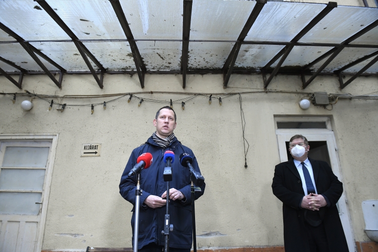 Fülöp Attila (KDNP), az Emberi Erőforrások Minisztériumának szociális ügyekért felelős államtitkára és Bajkai István fideszes országgyűlési képviselő (jobbra) a hajléktalanellátó szervezetek támogatásáról tartott sajtótájékoztatón a Hajléktalanokért Közalapítvány Szobi utcai központjában 2021. január 14-én. A kormány 134,5 millió forintos pályázatot írt ki a hajléktalanellátó szervezetek számára, hogy azok a koronavírus-járvány idején, illetve a várható hidegebb időben bővíteni tudják szolgáltatásaik körét (Fotó: MTI / Kovács Tamás)