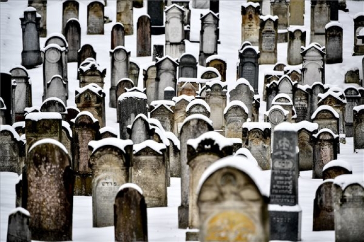 Sírok a behavazott tokaji zsidó temetőben 2019. január 25-én. (MTI fotó: Czeglédi Zsolt)