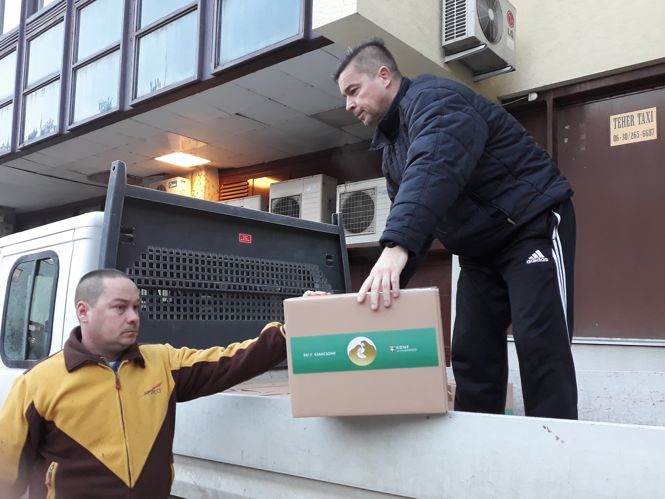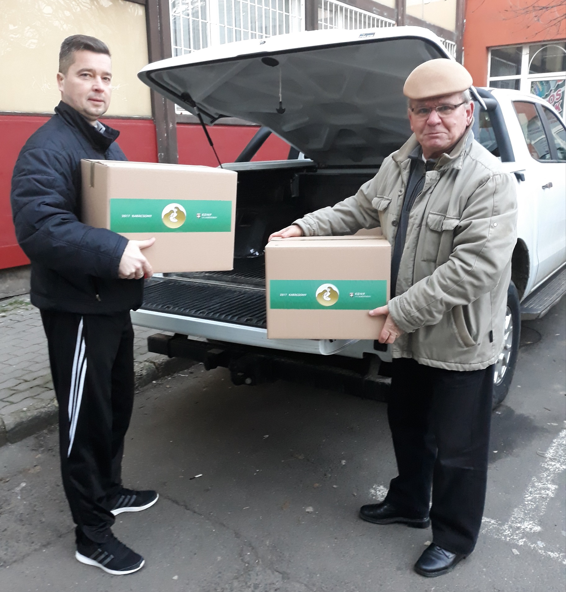 Urbányi Tamás megyei szervező és Bablena Ferenc, a KDNP Nógrád megyei elnöke a karácsonyi csomagokkal