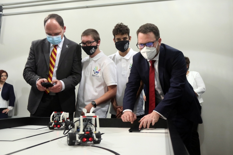 Schanda Tamás, az Innovációs és Technológiai Minisztérium parlamenti és stratégiai államtitkára, a KDNP alelnöke (jobbra) és Molnár Péter, a Miskolci Szakképzési Centrum főigazgatója, a KDNP miskolci elnöke (balra) robotautókat irányítanak a Képzési Információs és Élményközpont átadásán a Miskolci Szakképzési Centrumban 2021. november 18-án. Az országban elsőként Miskolcon nyílt ilyen létesítmény (Fotók: MTI / Vajda János)