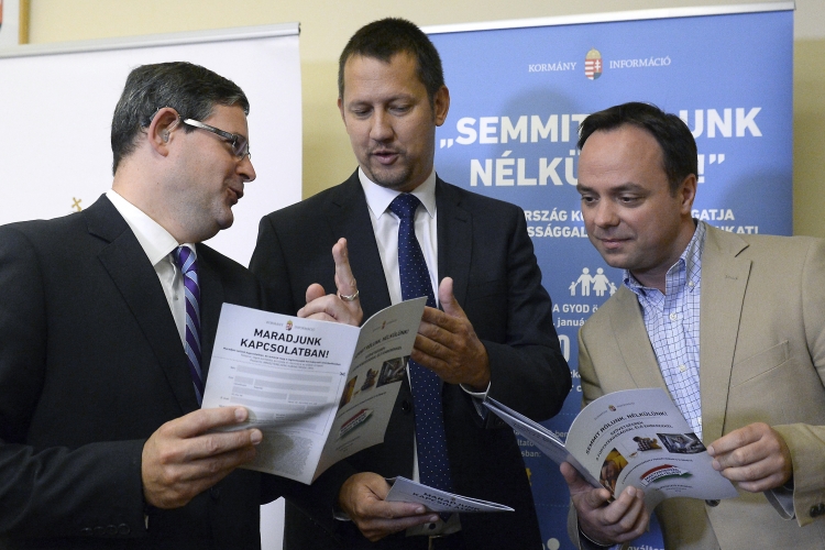Nyitrai Zsolt, a Miniszterelnöki Kabinetiroda kiemelt társadalmi ügyekért felelős miniszterelnöki megbízottja, Fülöp Attila szociális ügyekért felelős államtitkár és Kósa Ádám, a Fidesz-KDNP európai parlamenti képviselője (j-b) a fogyatékossággal élő embereket érintő intézkedéseket ismertető kiadványt bemutató sajtótájékoztatón az Emberi Erőforrások Minisztériumában 2019. szeptember 20-án. (MTI fotó: Soós Lajos)