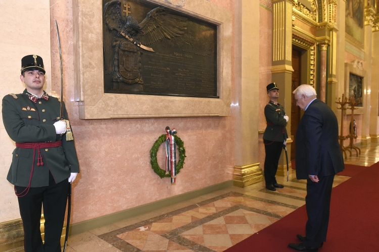 Május utolsó napja a Hősök Napja is. Latorcai János, az Országgyűlés kereszténydemokrata alelnöke koszorút helyezett el és főhajtással tisztelgett az első világháború áldozatainak emléktáblájánál az Országházban (Fotó: MTI / Bruzák Noémi)