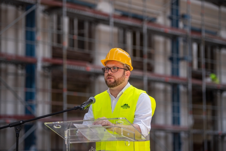 Schanda Tamás, az Innovációs és Technológiai Minisztérium parlamenti államtitkára beszél a Nyugati pályaudvar felújításáról tartott sajtótájékoztatón 2021. június 8-án. Lezárják a pályaudvart június 19. és július 18. között felújítási és karbantartási munkák miatt, ez idő alatt nem közlekednek a vonatok a főpályaudvaron (Fotó: MTI / Balogh Zoltán)