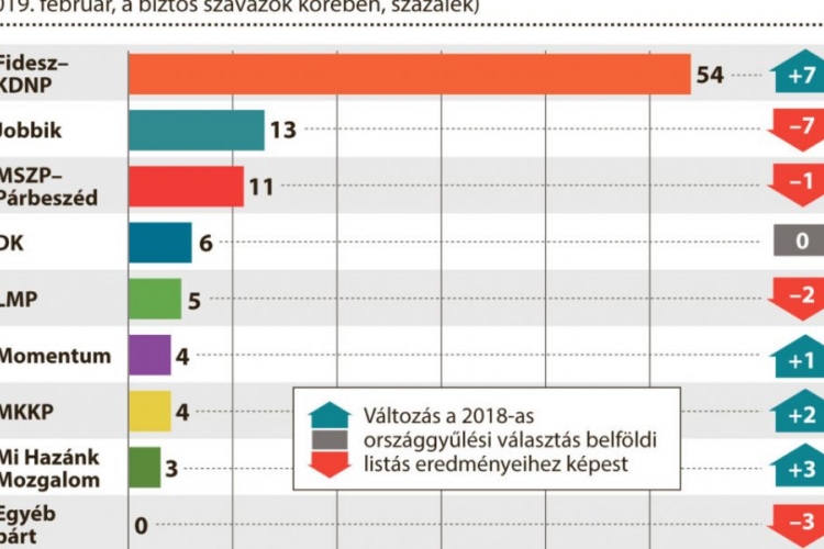 A lap pénteki számában megjelent felmérés szerint a tavaly áprilisi országgyűlési választás óta csak a kormánypártok tudták növelni népszerűségüket, most hét százalékkal többen szavaznának a Fidesz-KDNP-re. A nagyobb ellenzéki pártok (Jobbik, MSZP-Párbeszéd, LMP) népszerűsége a 2018. áprilisihoz képest csökkent, egyedül a kisebb ellenzéki pártok támogatottsága (Momentum, Magyar Kétfarkú Kutya Párt) nőtt, sőt új pártként a Mi Hazánk Mozgalom is mérhetővé vált a pártpalettán.