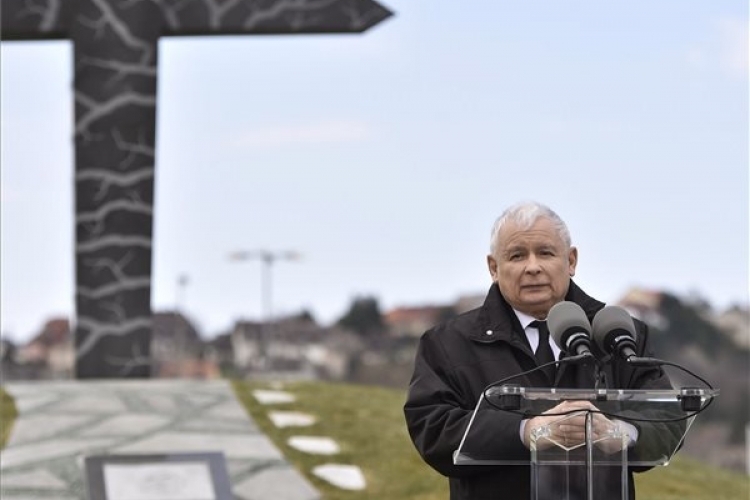 Jaroslaw Kaczynski, a lengyel kormányzó Jog és Igazságosság Párt (PiS) elnöke beszédet mond a szmolenszki légikatasztrófa áldozatainak emlékére állított, Mementó Szmolenszkért elnevezésű emlékmű felavatásán Budafokon 2018. április 6-án. MTI Fotó: Máthé Zoltán