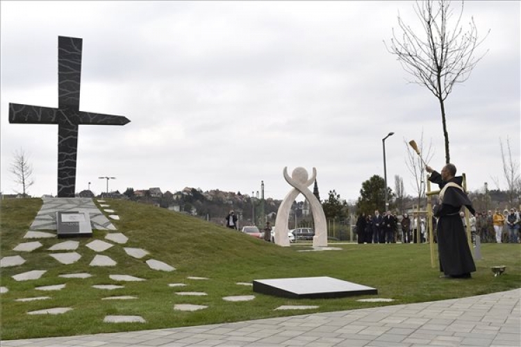 Pawel Cebula lengyel minorita szerzetes megáldja a szmolenszki légikatasztrófa áldozatainak emlékére állított, Mementó Szmolenszkért elnevezésű emlékművet Budafokon 2018. április 6-án. MTI Fotó: Máthé Zoltán