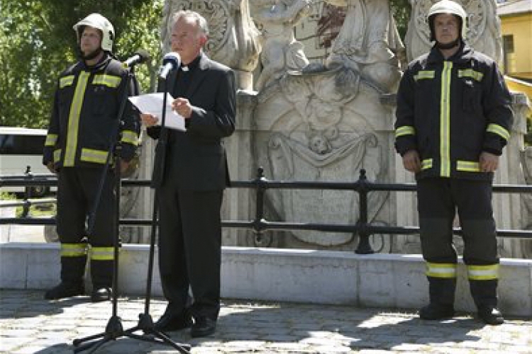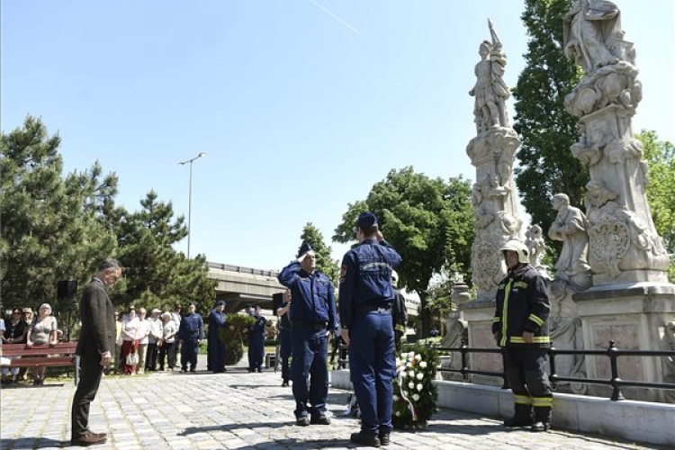 Tercsi Zoltán címzetes apát, az Óbudai Szent Péter és Pál főplébánia plébánosa beszél a Szent Flórián szoborcsoportnál, ahol az Óbuda Napja rendezvénysorozat keretében megemlékezést tartottak Óbuda védőszentjéről, Szent Flóriánról a III. kerületi Flórián téren 2018. május 3-án. (MTI Fotó: Bruzák Noémi)