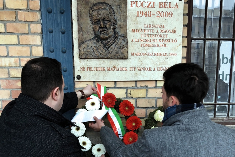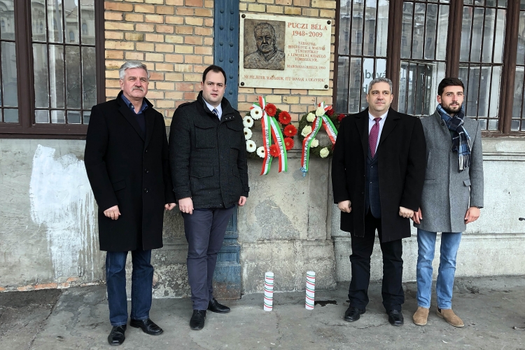 Nacsa Lőrinc, az Ifjúsági Kereszténydemokrata Szövetség elnöke és Sófalvi Szabolcs Marosszentgyörgy polgármestere koszorút helyezett el Puczi Béla budapesti Nyugati pályaudvarnál lévő emléktáblájánál (Fotó: Váli Miklós)