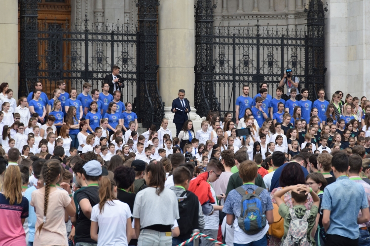 Az államtitkár ünnepi köszöntője után több mint ötezer, a Kárpát-medencéből érkezett gyermek énekelte el közösen a Kézfogás című dalt, majd a Himnuszt.