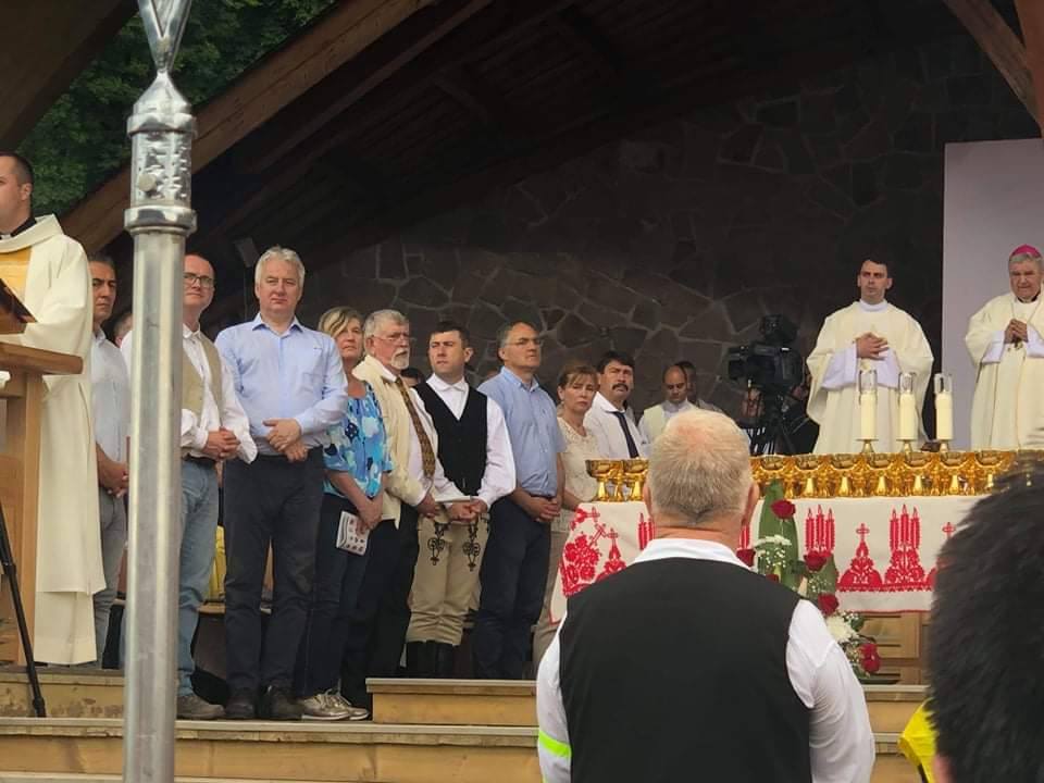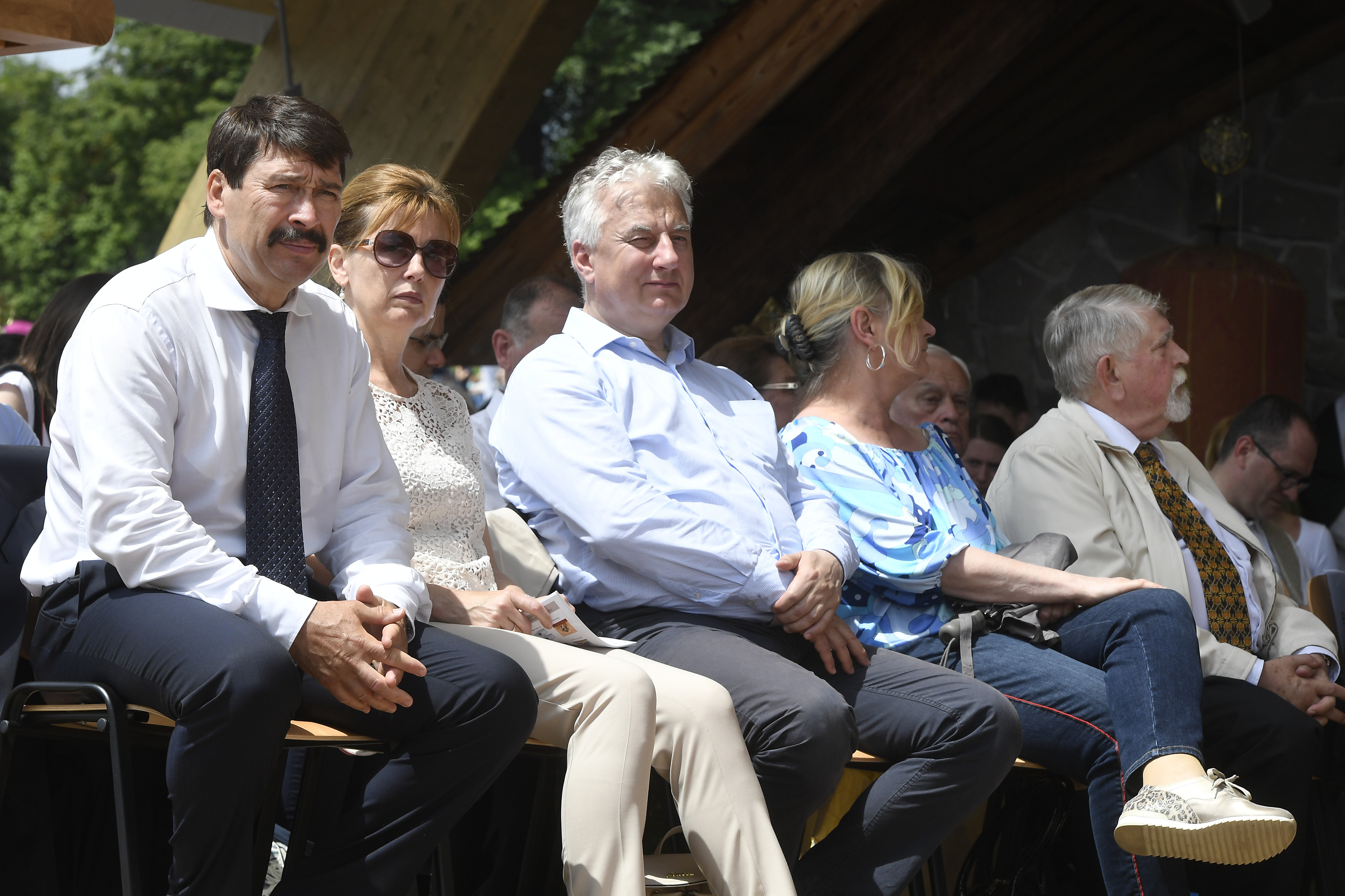 Áder János köztársasági elnök (balra) és felesége Herczegh Anita (balról a második), valamint Semjén Zsolt miniszterelnök-helyettes (balról a harmadik), Kásler Miklós, az emberi erőforrások minisztere (jobbra) és felesége, Liszkay Gabriella a csíksomlyói búcsú miséje előtt a Kis- és Nagysomlyó közti nyeregben 2019. június 8-án. Mögöttük Harrach Péter, a KDNP frakcióvezetője (Fotó: MTI / Koszticsák Szilárd)