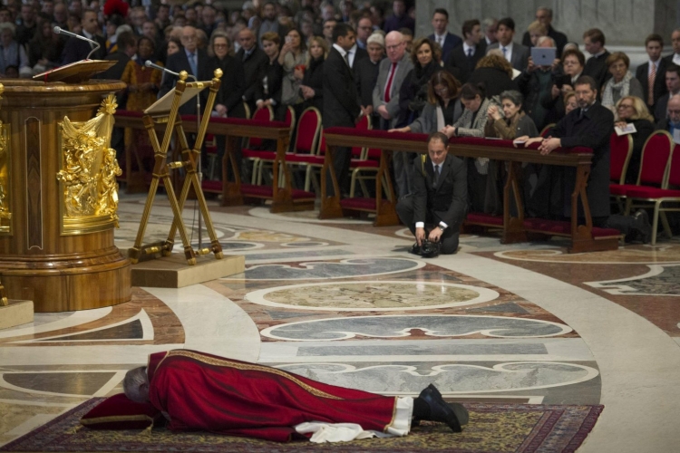 Ferenc pápa imádkozik a nagypénteki igeliturgiáján a vatikáni Szent Péter-bazilikában, 2016. március 25-én (Fotó: MTI/EPA pool/Giorgio Onorati)