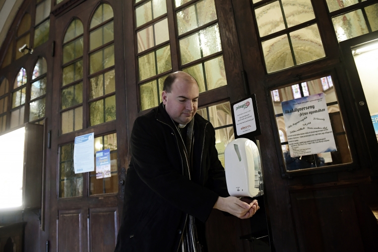 Budapest, 2020. március 6. Monostori László, az Árpád-házi Szent Margit-templom plébániai kormányzója a kihelyezett automata kézfertőtlenítőt használja az Árpád-házi Szent Margit-templomban a XIII. kerületi Lehel téren 2020. március 6-án (FOTÓ: MTI / Kovács Tamás)