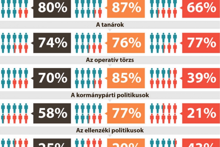Arra a kérdésre, hogy jól végzi-e a munkáját az egészségügyi ellátórendszer, nyolcvan százalék válaszolt igennel. Az évek óta kritikára edzett ellenzéki szavazók kétharmada (66 százalék) és a kormánypártiak kilenctizede (87 százalék) volt ezen az állásponton. A tanárok munkájával szintén nagyon magas az elégedettség (74 százalék), s a legjobban látható operatív törzs kapcsán is hetven százalék volt elégedett a teljesítménnyel.