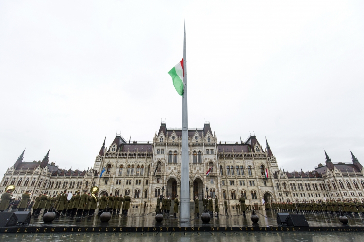 Katonai tiszteletadás mellett felvonják, majd félárbócra engedik Magyarország nemzeti lobogóját az Országház előtti Kossuth Lajos téren az 1956-os forradalom és szabadságharc leverésének 63. évfordulóján, a nemzeti gyásznapon, 2019. november 4-én. (MTI fotó: Mohai Balázs)
