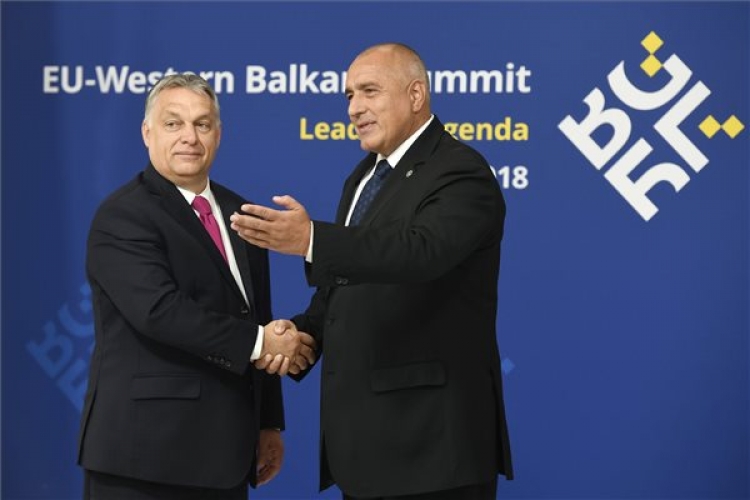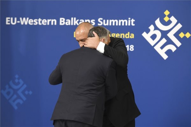 Bojko Boriszov, az EU soros elnökségét betöltő Bulgária miniszterelnöke (j) köszönti Orbán Viktor miniszterelnököt az EU és a nyugat-balkáni országok csúcstalálkozóján Szófiában 2018. május 17-én. (MTI Fotó: Koszticsák Szilárd)