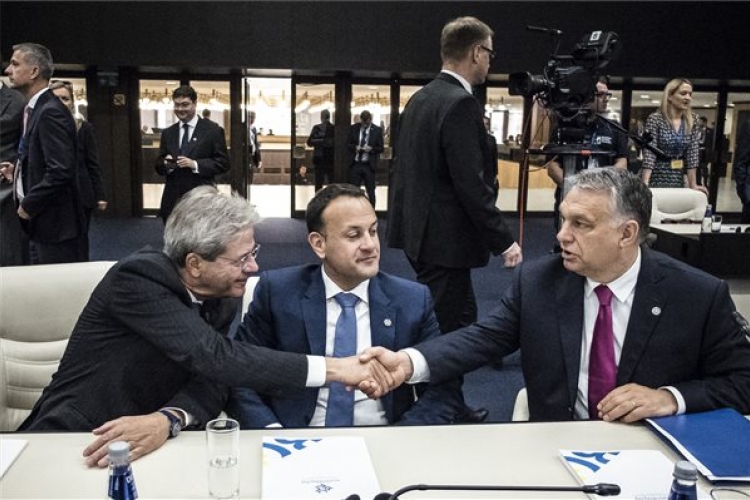 Orbán Viktor miniszterelnök (j) Paolo Gentiloni olasz miniszterelnök (b) és Leo Varadkar ír miniszterelnök (k) az EU és a nyugat-balkáni országok csúcstalálkozójának kezdete előtt Szófiában 2018. május 17-én. (MTI Fotó: Miniszterelnöki Sajtóiroda / Szecsődi Balázs)