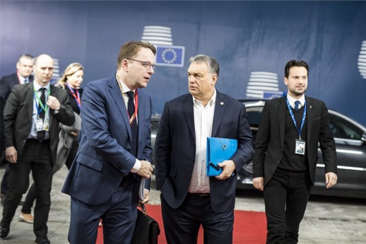 A Miniszterelnöki Sajtóiroda által közreadott képen Orbán Viktor miniszterelnök (középen) érkezik az EU állam- és kormányfői csúcstalálkozójának második napi ülésére Brüsszelben 2018. március 23-án. A kormányfő mellett balról Várhelyi Olivér nagykövet, a brüsszeli Állandó Képviselet vezetője, jobbról Havasi Bertalan, a Miniszterelnöki Sajtóiroda vezetője. MTI Fotó: Miniszterelnöki Sajtóiroda / Szecsődi Balázs