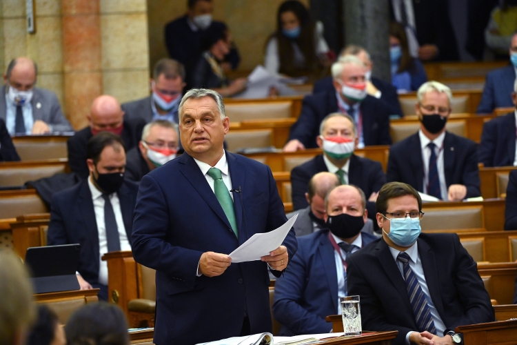 Orbán Viktor miniszterelnök felszólal az azonnali kérdések órájában az Országgyűlés plenáris ülésén 2020. október 19-én. A kormányfő mellett jobbról Gulyás Gergely, a Miniszterelnökséget vezető miniszter. (MTI fotó: Bruzák Noémi)