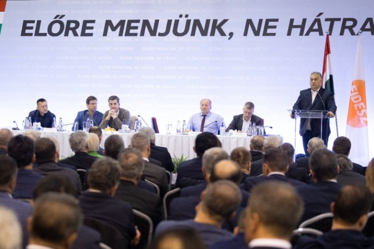Orbán Viktor, a Fidesz elnöke beszédet mond a Fidesz–KDNP közös frakcióülésén Balatonfüreden 2022. február 16-án. Az asztalnál Rogán Antal, a Miniszterelnöki Kabinetirodát vezető miniszter, Gulyás Gergely Miniszterelnökséget vezető miniszter, Kocsis Máté, a Fidesz frakcióvezetője, Simicskó István, a KDNP frakcióvezetője és Kubatov Gábor, a Fidesz pártigazgatója (balról jobbra). (Forrás: MTI/Miniszterelnöki Sajtóiroda/Fischer Zoltán)