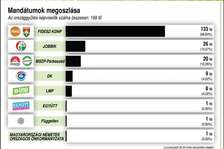1. FIDESZ-KDNP: egyéni választókerület: 91, országos lista: 42, összesen: 133, a parlamenti mandátumok aránya: 66,83 százalék.