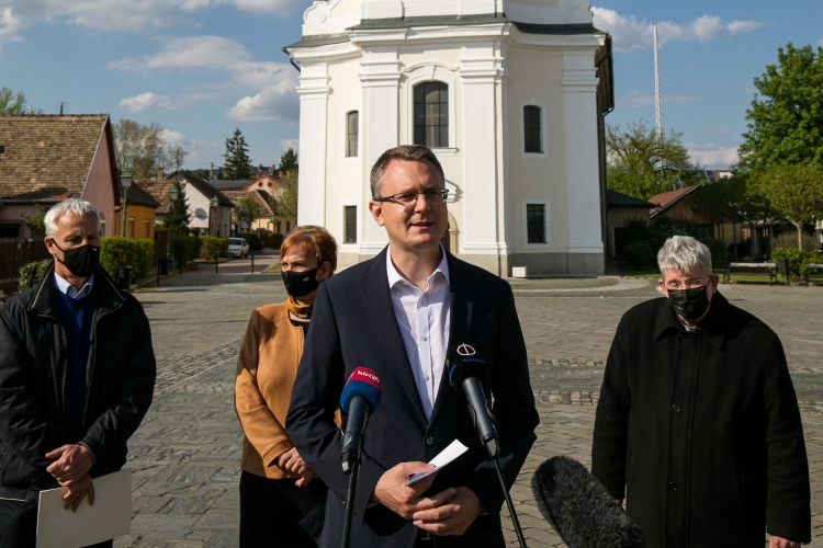 Rétvári Bence, az Emberi Erőforrások Minisztériumának (EMMI) parlamenti államtitkára, a térség KDNP-s országgyűlési képviselője, a párt alelnöke (balról a harmadik), Soltész Miklós, a Miniszterelnökség egyházi és nemzetiségi kapcsolatokért felelős államtitkára, a KDNP alelnöke Ferencz Gyöngyi polgármester és Medgyes Tibor plébános (balról jobbra) közös sajtótájékoztatójukon a szobi római katolikus templom előtt 2021. május 3-án. Pest megye északi részén 213 millió forintos kormányzati támogatásból 12 településen 16 templom újul meg (Fotó: MTI / Mohai Balázs)