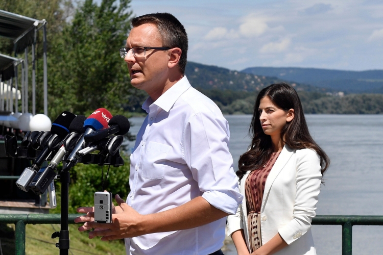 Rétvári Bence, az Emberi Erőforrások Minisztériumának (Emmi) parlamenti államtitkára, a térség kereszténydemokrata párti országgyűlési képviselője beszédet mond a nagymarosi kikőben tartott sajtótájékoztatón 2020. július 9-én. Jobbról Szentkirályi Alexandra kormányszóvivő. (MTI fotó: Máthé Zoltán)