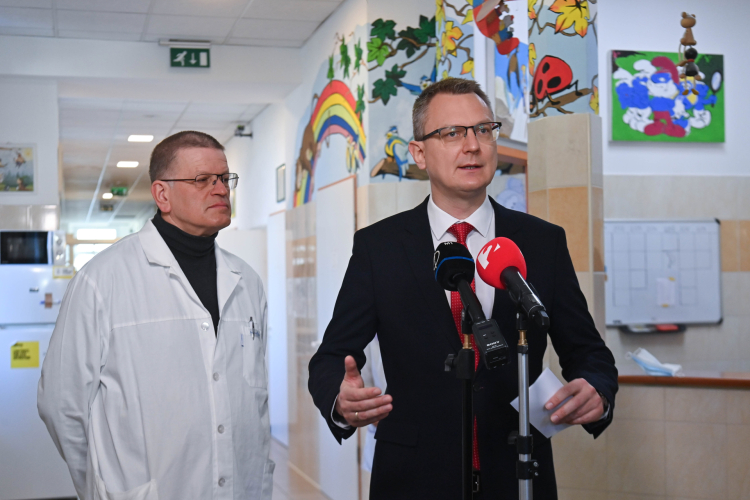 Rétvári Bence, a Belügyminisztérium parlamenti államtitkára (j) és Velkey György, a Bethesda Gyermekkórház főigazgatója a kórházban tartott sajtótájékoztatón 2024. március 20-án. Tizennégy hónapos tesztidőszak után folytatódik az újszülöttek és csecsemők SMA-szűrése, a költségvetés e célra idén 450 millió forintot biztosít. MTI/Bruzák Noémi