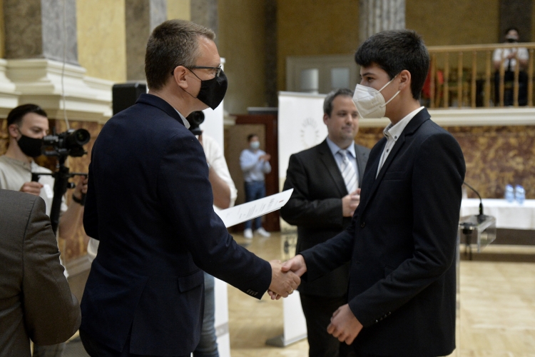 Trauner Ádám a Városmajori Gimnázium 10. évfolyamos diákja átveszi az 1. helyezettnek járó oklevelet Rétvári Bencétől, az Emberi Erőforrások Minisztériumának (Emmi) parlamenti államtitkárától a Kosáry Domokos Történelemverseny eredményhirdetésén a Magyar Nemzeti Múzeumban 2021. június 12-én (Fotó: MTI / Soós Lajos)