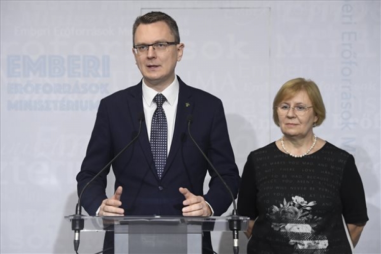 Rétvári Bence (KDNP), az Emberi Erőforrások Minisztériumának (Emmi) parlamenti államtitkára (b) és Hulák Zsuzsanna, az Idősek Tanácsának tagja (j) sajtótájékoztatót tart a kormányzat nyugdíjasokat érintő intézkedéseiről, aktualitásokról az Emberi Erőforrások Minisztériumában 2019. február 8-án. (MTI fotó: Kovács Tamás)