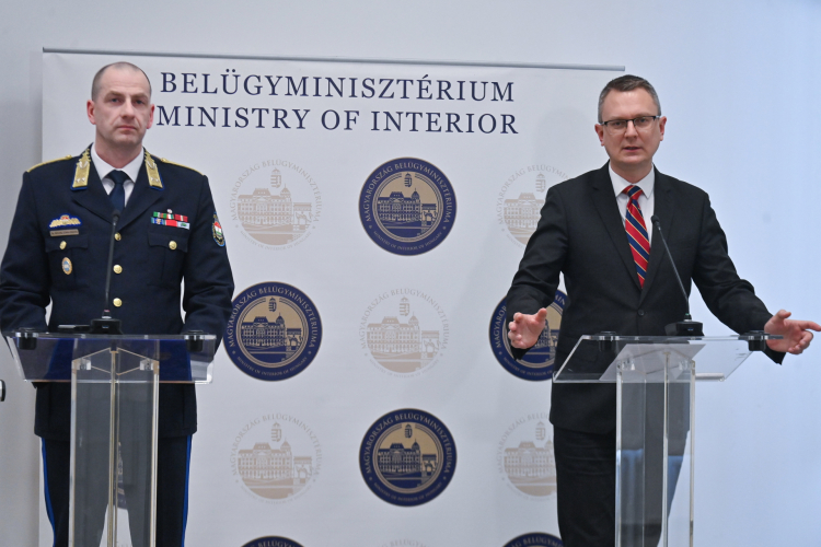 Rétvári Bence, a Belügyminisztérium parlamenti államtitkára (j) és Kuczik János Zoltán országos rendőrfőkapitány-helyettes (b) az Egy éve történtek a brutális antifatámadások Budapesten címmel tartott sajtótájékoztatón a Belügyminisztériumban 2024. február 14-én. MTI/Bruzák Noémi