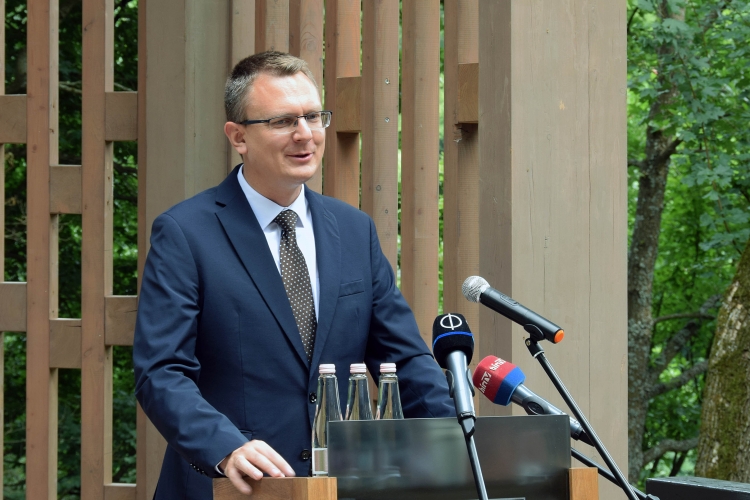 Rétvári Bence (KDNP), az Emberi Erőforrások Minsztériumának parlamenti államtitkára beszédet mond az egykori pálos kolostor helyén létesített emlékhely felavatásán Márianosztrán 2020. június 25-én. (KDNP fotó: Váli Miklós)