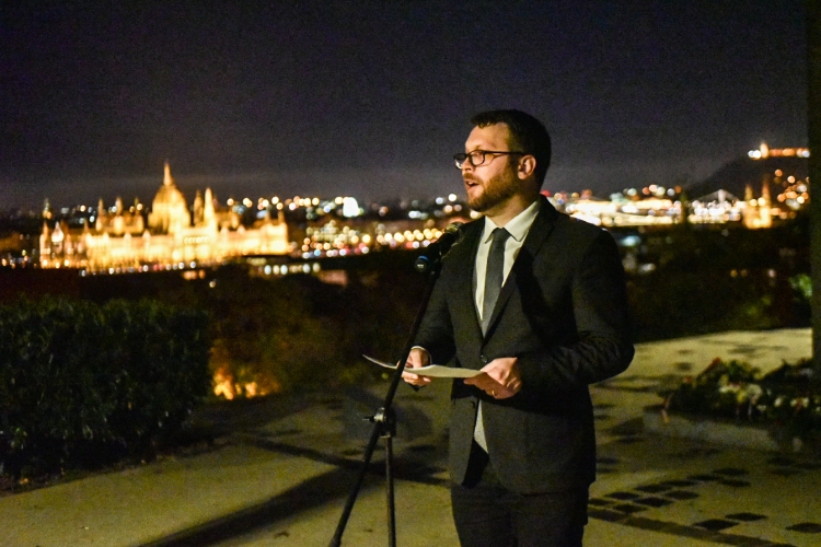 Schanda Tamás (KDNP), az Innovációs és Technológiai Minisztérium államtitkára beszédet mond 2019. november 4-én, a nemzeti gyásznap alkalmából Budapesten, a Mansfeld-parkban (ITM fotó: Véssey Endre)