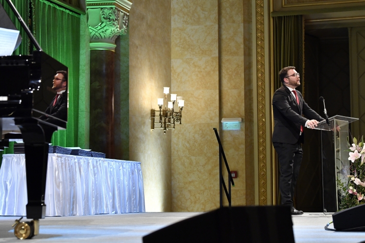 Schanda Tamás, az Innovációs és Technológiai Minisztérium parlamenti és stratégiai államtitkára köszöntőt mond az egyetemi és főiskolai tanári kinevezések átadóján a Pesti Vigadóban 2020. november 6-án. (MTI fotó: Máthé Zoltán)
