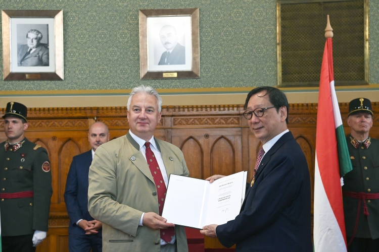 Semjén Zsolt miniszterelnök-helyettes (balra) a magyar-kínai gazdasági kapcsolatok előmozdítása érdekében végzett kiemelkedő tevékenysége elismeréseként átadja a Magyar Arany Érdemkereszt kitüntetés Frank Liunak, a Chi Fu Investment Holdings Group cégcsoport elnök-vezérigazgatójának az Országházban 2021. június 22-én. A kitüntetést Orbán Viktor miniszterelnök felterjesztése alapján Áder János köztársasági elnök adományozta (Fotók: MTI / Bruzák Noémi)